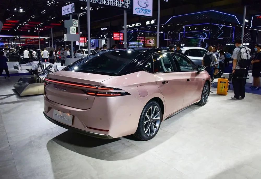 车尾采用了全新样式的贯穿式尾灯,整车档次都提升了,这款车除了冰玫粉之外,还有全息银这款新色,全息银在阳光下呈现的是黄色,阴影下则是冰蓝色,之所以有“变色龙”的特质,是因为AION S Plus的车漆加入了纳米级变色珠光粉,做到了目前量产车中变色幅度最大的级别。质感整体上升,希望大家看到AION S不再觉得它是一款网约车了。