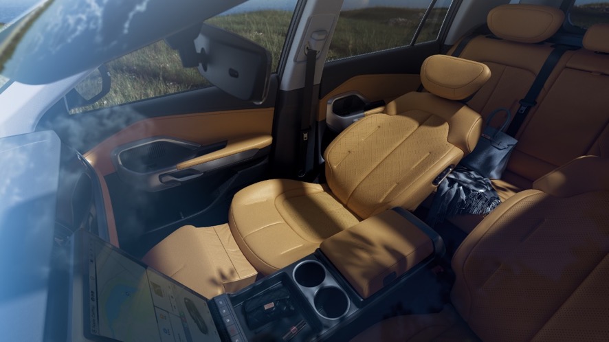 自游家NV内饰设计呈现出极简、沉浸、智能的座舱体验。座椅采用高等级Nappa真皮包覆,用植物鞣制工艺保留其天然质感的同时,运用业内首创的刺绣吊紧技术,在功能和美感上实现统一。沉浸式副驾座椅(Air Lounge) 采用宽体头枕和椅垫,靠背可放倒至167°,腿托可调至全平,配合三档可调座椅按摩与通风加热功能,可极大地缓解旅途劳顿。自游家NV全景天幕采用一整片1.71㎡双层镀银隔热玻璃,可隔绝99.9%紫外线,热阻隔率超过83%,达到行业顶尖水平;基于安全考量,车内保留天幕横梁,顶压载荷值超过125,100N。此外,空调出风口搭载的可读取温度/风量/PM2.5的Mini健康显示屏、内置6颗线性微动马达可实现RealTouch触觉振动反馈的中控屏、提供绝佳NVH性能的双层夹胶静音玻璃、15个扬声器打造的多维声音响系统(Immersive Sound)等细节巧思,均呈现自游家NV实用易用理念下的豪华质感。