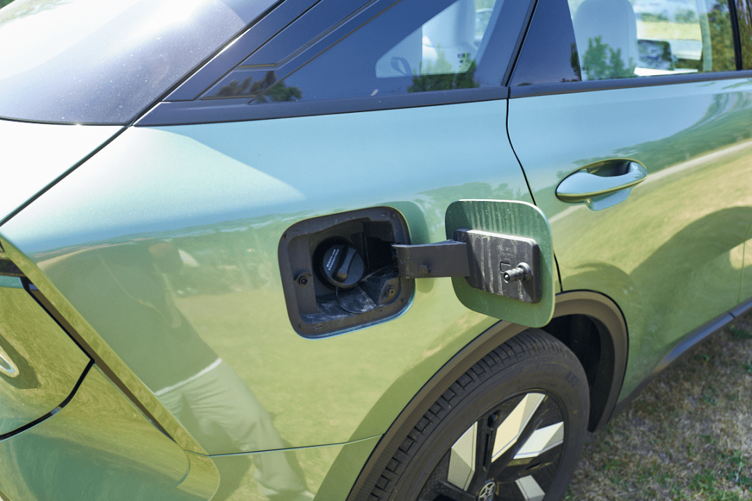 车侧没有太大的变化,明显的双腰线,搭配19吋轮毂,勾勒出彰显个性的肌肉感。不过,有些车型采用了双色车身,比如我们试驾的“不焦绿”车色,顶部、ABCD柱、后视镜等位置都涂成了黑色,和车身整体的绿色搭配,时尚而有特色。此外,车侧还增加了一个充电口,一边加油,一边充电。